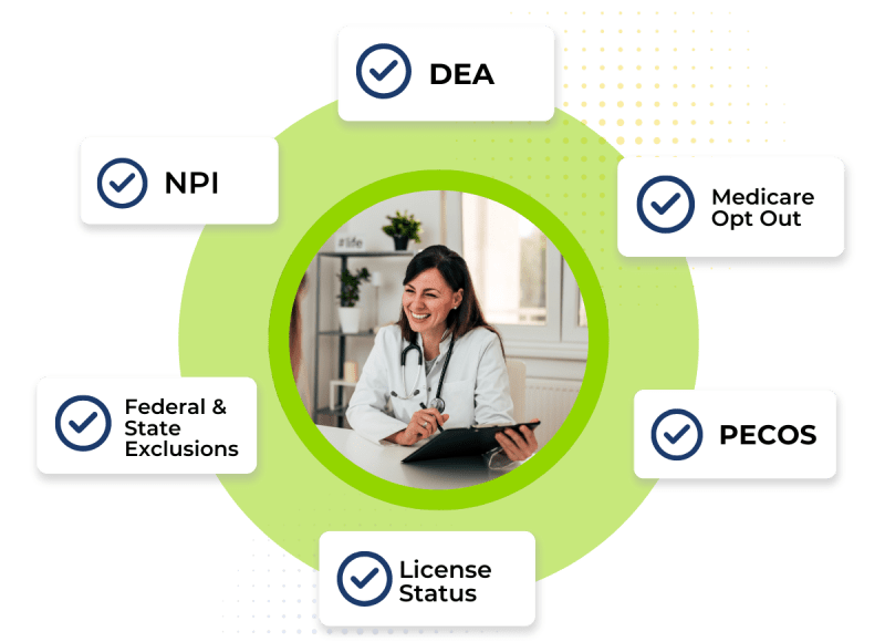 Screen against state & federal exclusions, NPI, license status, DEA, PECOS, and medicare opt out